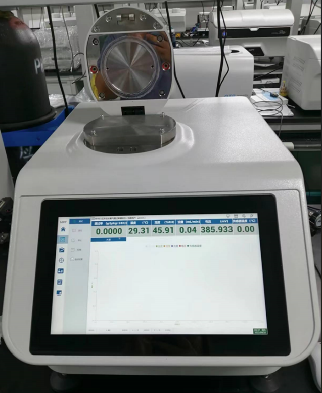 測試過程:樣品放進23℃的環境中狀態調節48h后,安裝到泡罩夾具,涂膜密封脂,把夾具安裝到儀器腔體位置。流量設置為20mL/min,開始測試。