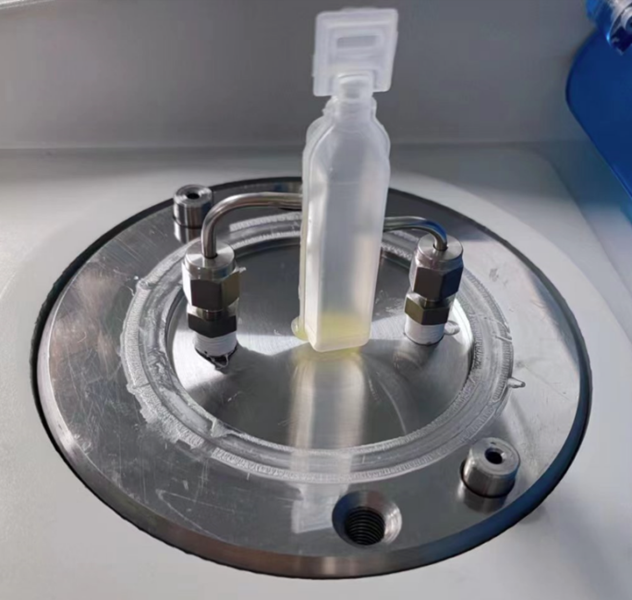 1、將待測試的塑料安瓿瓶安放在專用的測試夾具上,并用密封脂密封塑料管中部與夾具連接的孔隙。密封完成后,蓋上夾具的外蓋,并擰緊。