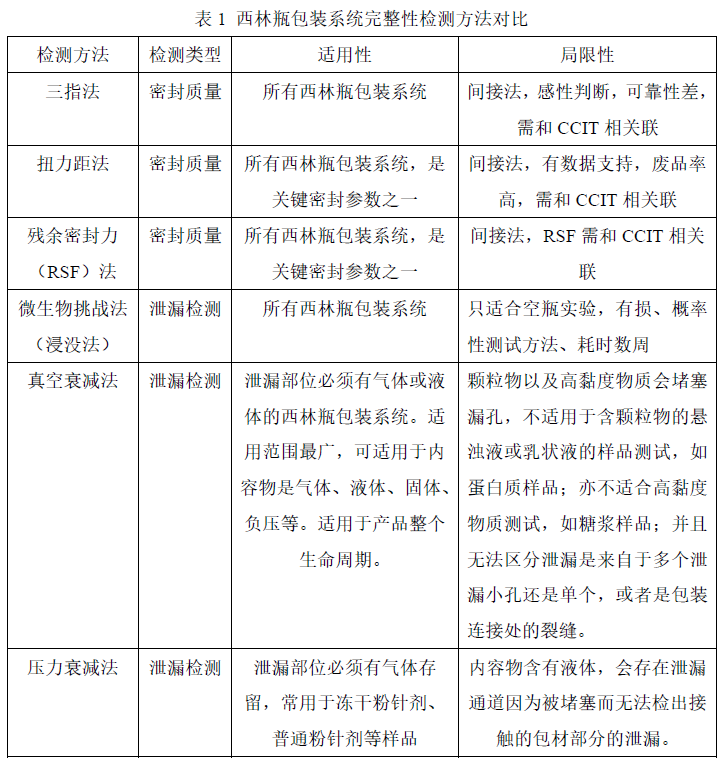 總的來說,我國的西林瓶包裝系統密封完整性檢查研究還處于初級階段。密封完整性的方法各有優劣,需重點關注內容物的形態來選擇合適的檢測方法,確保密封完整性檢查的順利通過。包裝密封質量檢測(Seal Quality Test )和包裝泄漏測試(Integrity Leak Test)共同確保整個產品生命周期的包裝系統密封性,結合使用可加強產品生產過程控制。現針對以上提及的檢測方法的適用性及局限性做對比,見下表1。