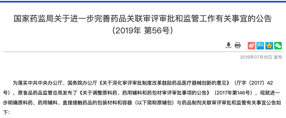 為落實(shí)中共中央辦公廳、國(guó)務(wù)院辦公廳《關(guān)于深化審評(píng)審批制度改革鼓勵(lì)藥品醫(yī)療器械創(chuàng)新的意見(jiàn)》(廳字〔2017〕42號(hào)),原食品藥品監(jiān)管總局發(fā)布了《關(guān)于調(diào)整原料藥、藥用輔料和藥包材審評(píng)審批事項(xiàng)的公告》(20