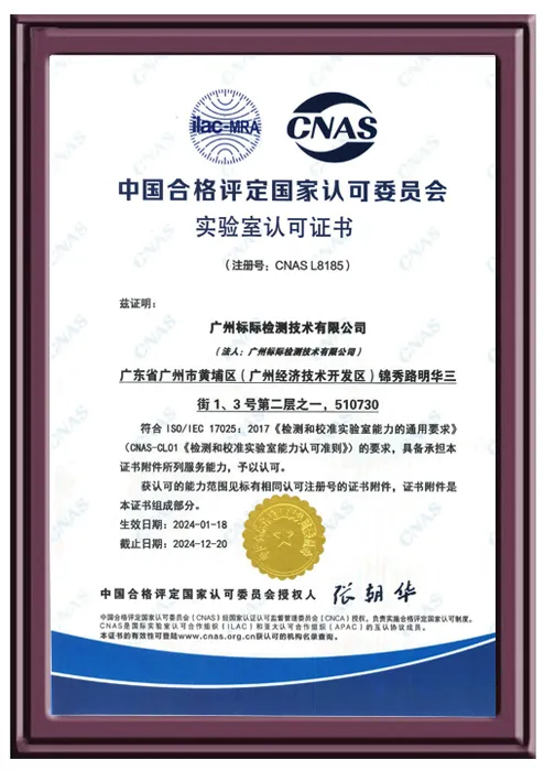 檢測實驗室通過了中國合格評定國家認(rèn)可委員會(CNAS)認(rèn)可的實驗室(注冊編號:L8185),我們獲得了檢驗檢測機(jī)構(gòu)資質(zhì)認(rèn)定(CMA),證書編號:201819003511,這標(biāo)志著我們的檢測服務(wù)符合國家和國際標(biāo)準(zhǔn),檢驗報告可用于產(chǎn)品質(zhì)量評價、成果及司法鑒定,具有法律效力。