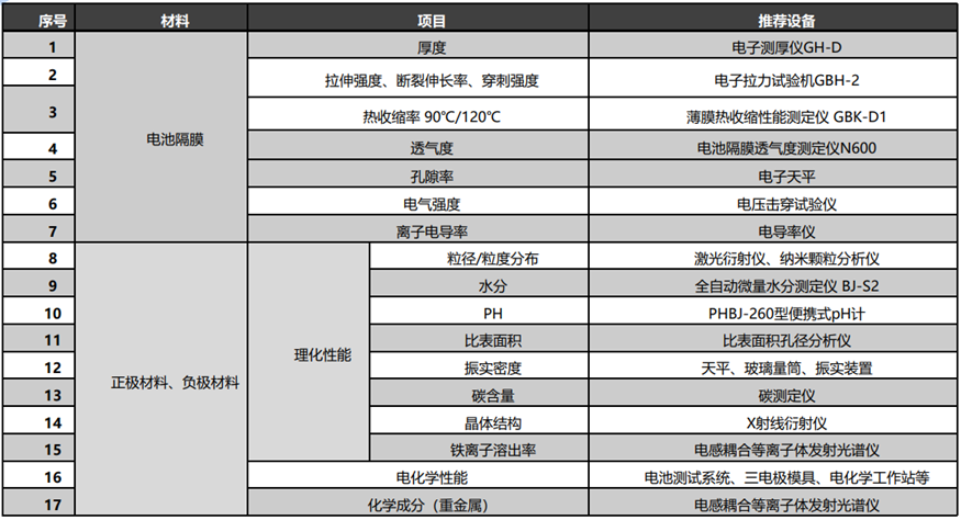 36363-2018 鋰離子電池用聚烯烴隔膜、DB44T 1152-2013 鋰離子電池聚乙烯隔膜等,對電池隔膜的性能要求進行了明確的規(guī)定,重點關(guān)注的項目有厚度、拉伸穿刺等力學性能,薄膜收縮率、透氣性、孔隙率、水分等,相關(guān)項目匯總(包含正負極材料)見下圖: 在相關(guān)測試設備中,我司測厚儀、拉力機、薄膜熱收縮性測試儀、透氣度測試儀均可用于電池隔膜的檢測。 對于燃料電池,質(zhì)子交換膜燃料電池(PEMFC)使用可再生的能源資源-氫氣,可實現(xiàn)零排放,是一種綠色、清潔、高效、可持續(xù)發(fā)展的一種新能源動力技術(shù),在航空航天、汽車和能源等行業(yè)具有廣泛的應用。質(zhì)子交換膜(PEM)是質(zhì)子交換膜燃料電池中最重要的部件之一,隨著燃料電池的不斷發(fā)展,對質(zhì)子交換膜性能的要求也逐漸升高,根據(jù)GB/T 20042.3-2022《質(zhì)子交換膜燃料電池 第3部分: 質(zhì)子交換膜測試方法》,質(zhì)子交換膜需要開展的測試項目包括透氣率、拉伸性能、180°剝離強度、厚度、質(zhì)子傳導率、離子交換當量等測試項目。其中GB/T